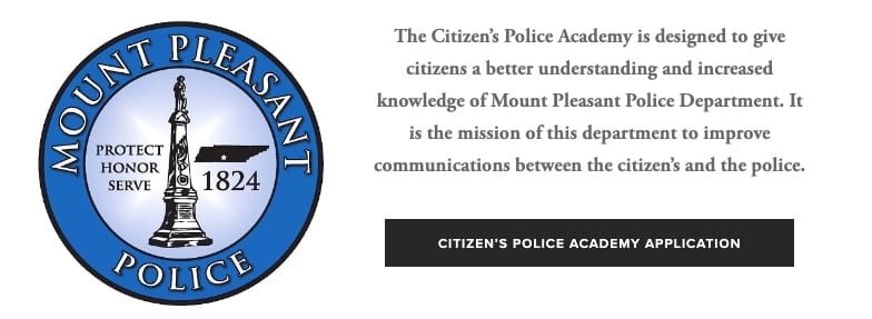 The academy is open to anyone age 21 and older, with priority given to those who live or work within Mt. Pleasant city limits. Applications can be downloaded from the police department’s website and mailed to the Mount Pleasant Police Department, Attn: Officer Cory England, at P.O. Box 426, Mt. Pleasant, TN 38483.