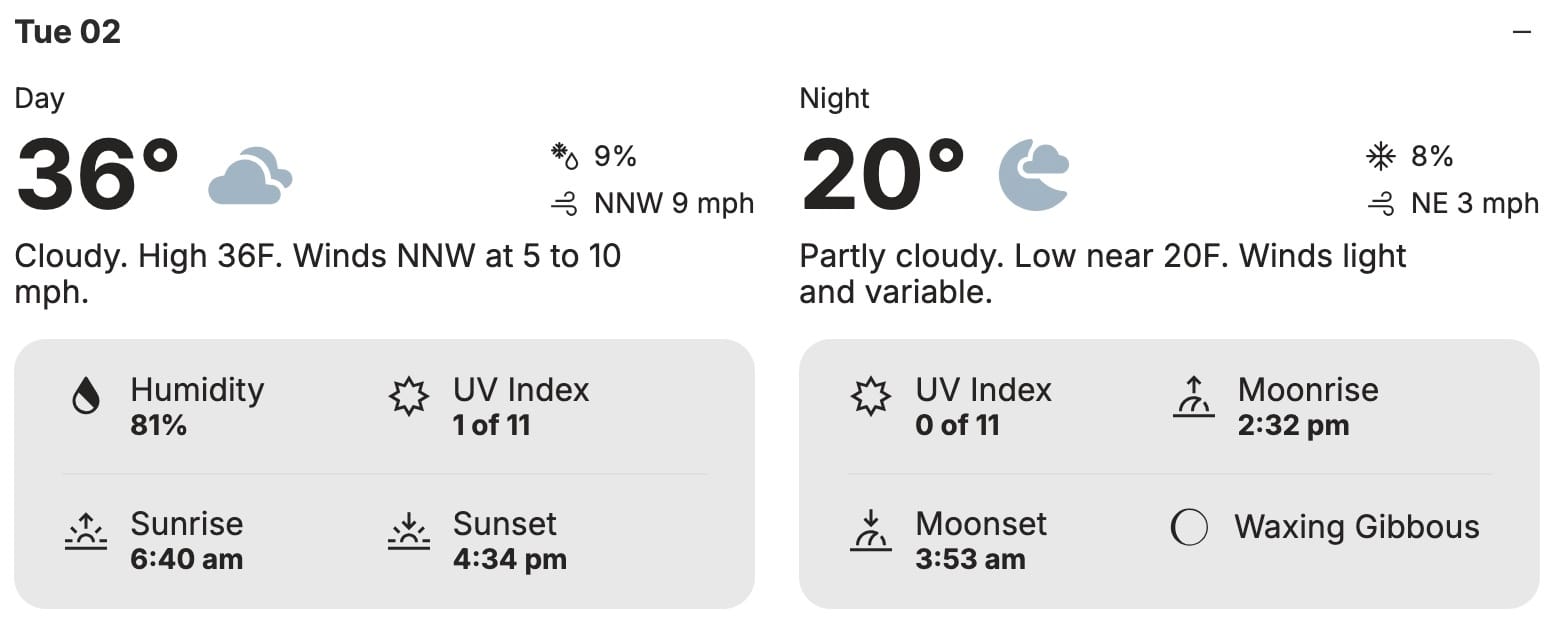 ☁️ Columbia’s Weather - Cloudy w/ high of 36, low of 20