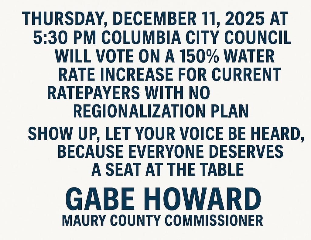 Two of Maury County’s leaders — County Commissioner Gabe Howard and County Mayor Sheila Butt — have issued strong public statements ahead of Thursday’s Columbia City Council vote on the proposed $500 million CPWS water project and the projected rate increases tied to it. Both leaders took to social media this week to outline their concerns, urge regional cooperation, and call for broader public involvement before the council moves forward. Their full statements are included below.