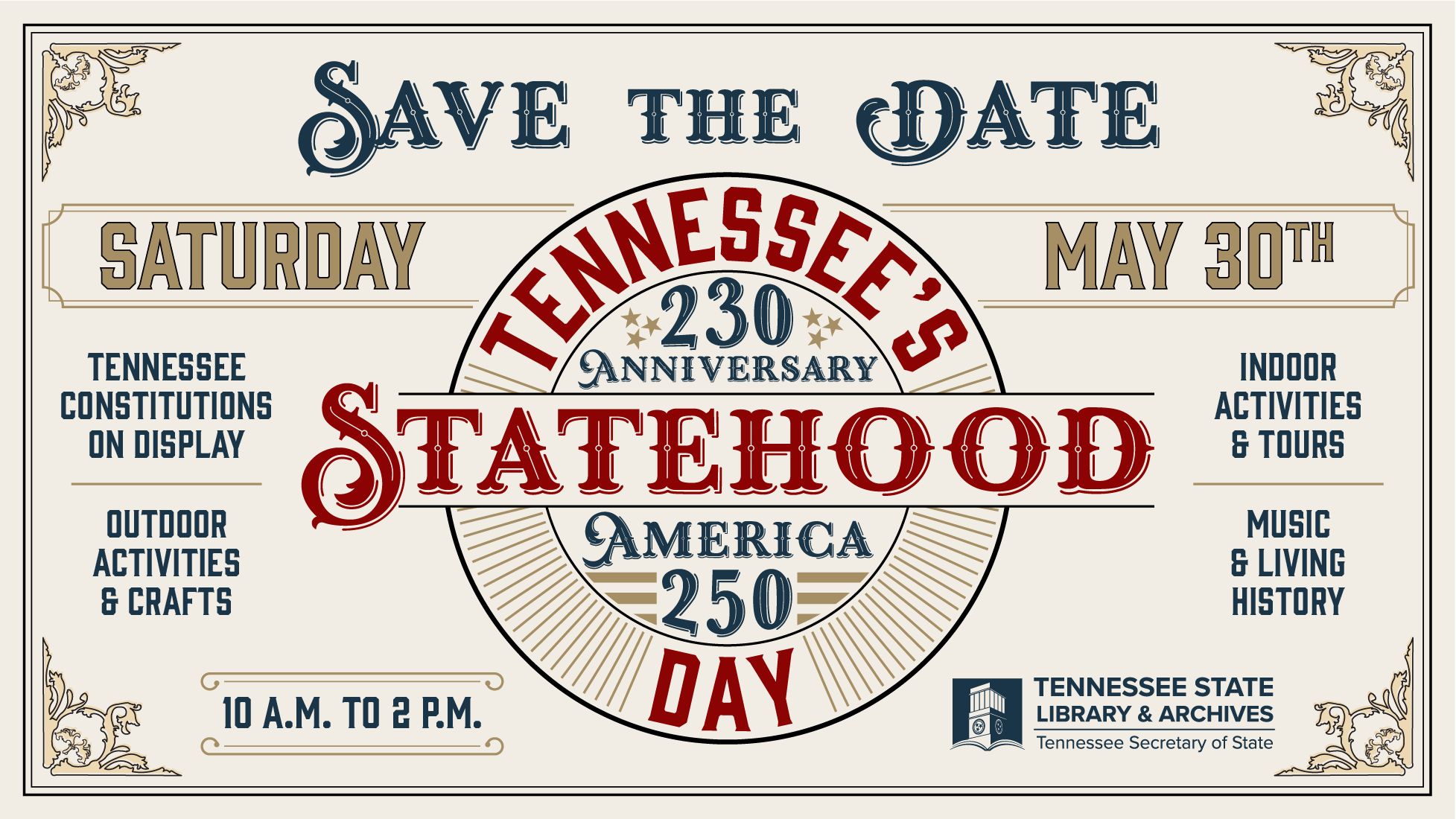 “This year’s Tennessee Statehood Day celebration is both special and historic as we celebrate America’s 250 years as a country and Tennessee’s vital and numerous contributions in helping to shape the path of the United States of America,” said Secretary of State Tre Hargett. “We hope Tennesseans will join us in celebrating our state’s rich history, which will be on display at the Library & Archives.”